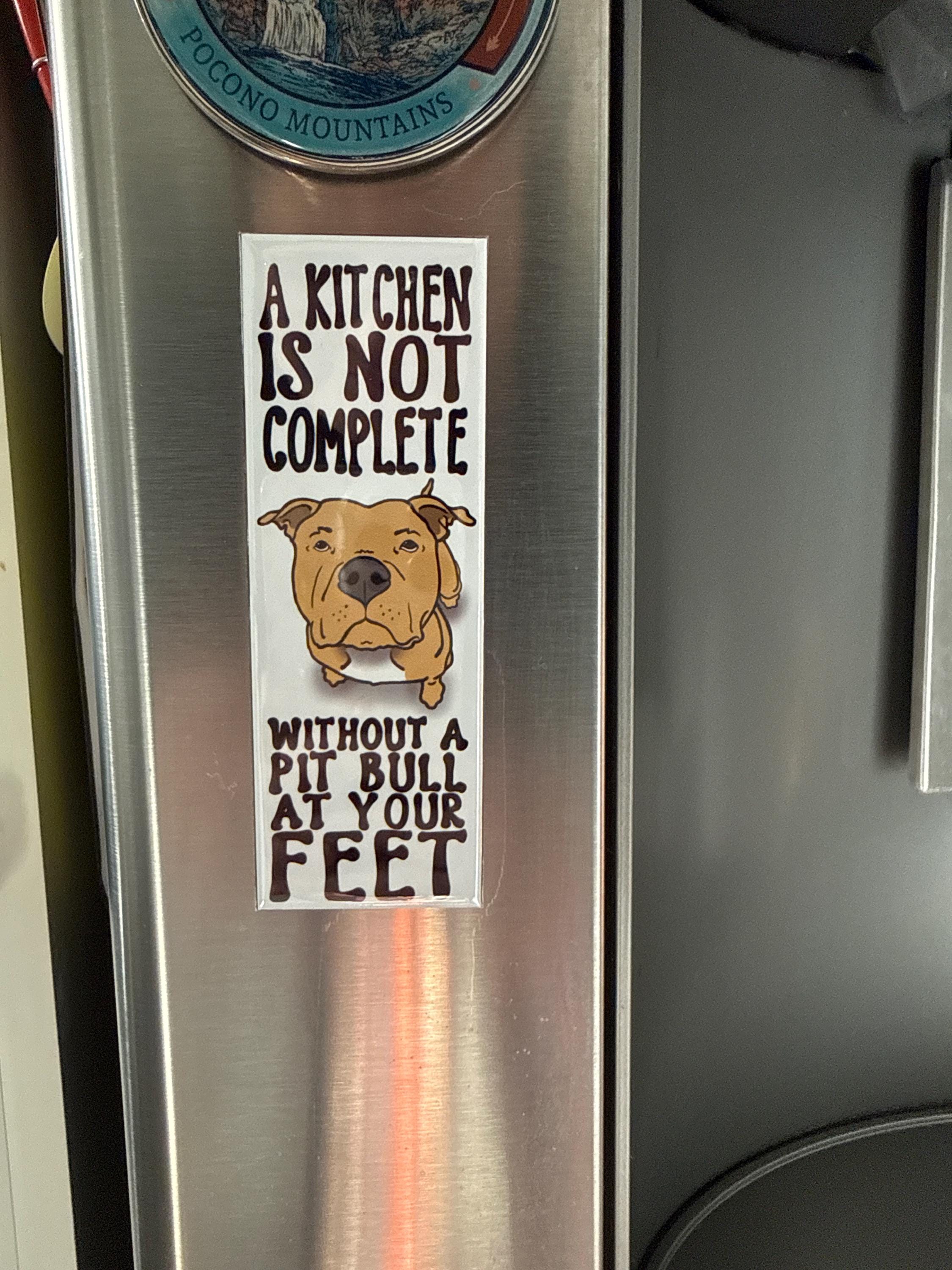 This handmade magnet features a hand illustrated portrait of a Pit Bull dog upon a white background with the caption "A KITCHEN IS NOT COMPLETE, WITHOUT A PIT BULL AT YOUR FEET!". This design is available in 6 different colors. Choose from tricolor, red, fawn, white, gray or black . This listing is for a single magnet. Please select color choice when checking out.